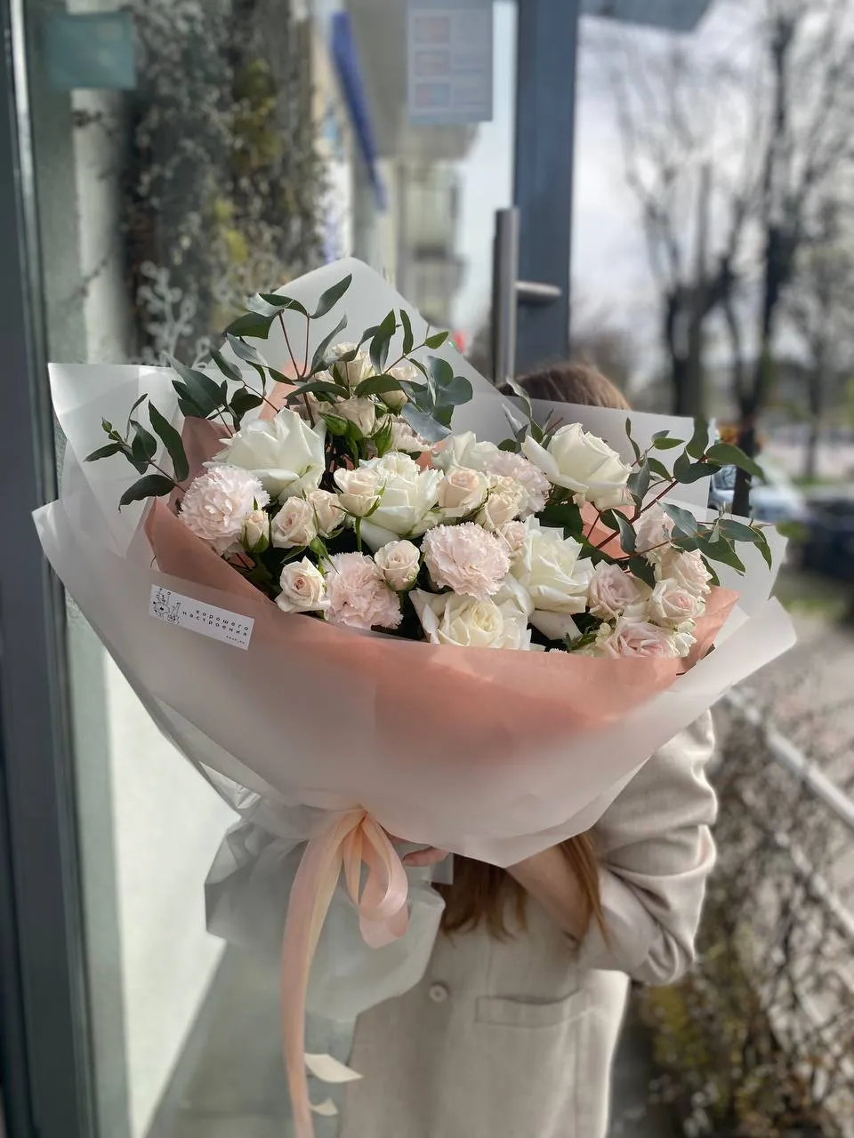 Этот букет – настоящее воплощение нежности, гармонии и природной красоты. Его воздушная композиция сочетает в себе изысканные белые французские розы, символизирующие чистоту и элегантность, трепетные кустовые розы в мягких кремово-розовых оттенках, которые добавляют тепла и уюта, а также утончённые диантусы, создающие объём и подчёркивающие аристократичность букета.Завершающий аккорд – свежий эвкалипт, который придаёт композиции динамичность и лёгкую природную свежесть. Аккуратная упаковка в нежных пастельных тонах дополняет образ, делая букет по-настоящему элегантным и стильным.